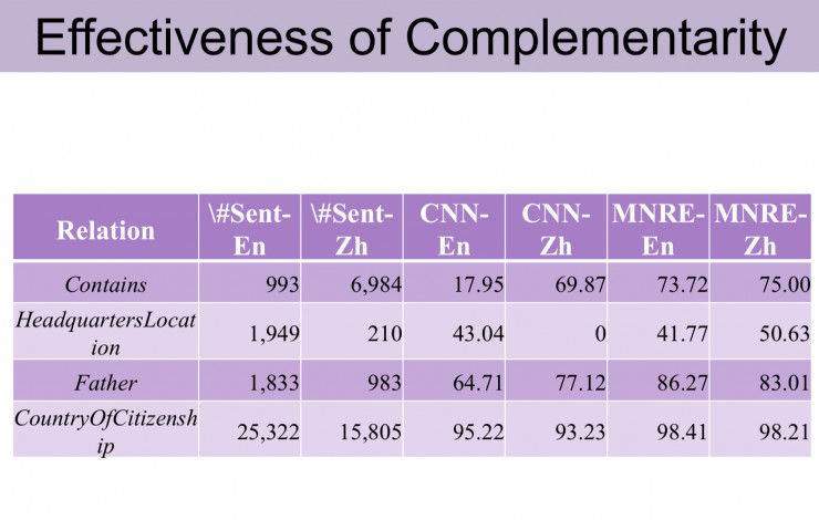 第二部分工作是关于知识抽取。我主要做的是文本关系抽取方面的工作。我们提出了多元的关系抽取系统,无论是在中文数据下或者在英文数据下,它抽取效果都比原始的有了非常大的提高。
