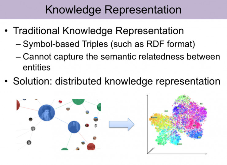 知识表示其实就是将知识图谱里面的实体对应为一个空间中的向量,传统的知识图谱是以一种三元组形式去展现的,现有知识表示方法在模型复杂度较小的情况下,效果是非常好的。我们主要工作有两点,就是去解决现知识表示方法存在的一些问题。第一个它无法去对知识图谱中的复杂关系进行建模。第二个,它无法针对知识图谱内部的关系路径去做建模。