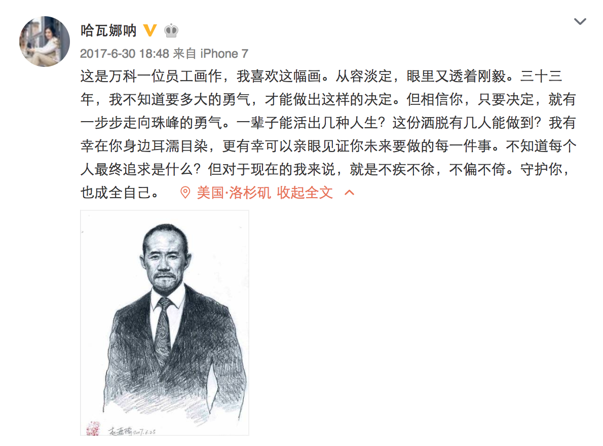当天下午,王石女友田朴珺发微博深情告白:“我有幸在你身边耳濡目染,更有幸可以亲眼见证你未来要做的每一件事。不知道每个人最终追求是什么?但对于现在的我来说,就是不疾不徐,不偏不倚。守护你,也成全自己。”