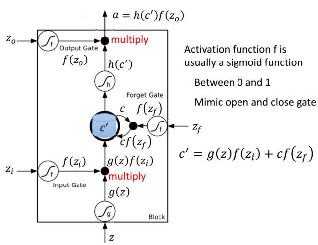 以下是 LSTM 单元的详细结构,其中 Z 为输入部分,Z_i、Z_o 和 Z_f 分别为控制三个门的值,即它们会通过激活函数 f 对输入信息进行筛选。一般激活函数可以选择为 Sigmoid 函数,因为它的输出值为 0 到 1,即表示这三个门被打开的程度。