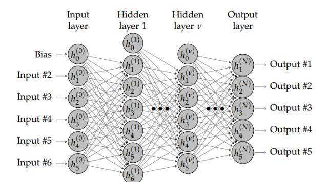图 4.1:有 N + 1 层(N − 1 个隐藏层)的神经网络。浅层网络架构仅使用一个隐藏层。深度学习需要使用多个隐藏层,通常包含同样数量的隐藏神经元。数量大约是输入和输出变量数量的平均值。