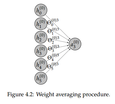 加权平均过程,即将前一层给神经元的激励值和对应的权重矩阵相乘而得出后一个神经元的输入值,这一过程展示在下图 4.2 中,我们可以说前一层神经元的加权和就是后一层神经元的输入。