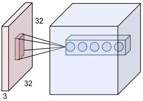 为了理解卷积层,下图展示了卷积核或滤波器(filter)将当前层级上的一个子结点张量转化为下一层神经网络上的一个长和宽都为 1,深度不限的结点矩阵。下图输入是一个 32×32×3 的张量,中间的小长方体为卷积核,一般可以为 3×3 或 5×5 等,且因为要计算乘积,那么卷积核的第三个维度必须和其处理的图像深度(即输入张量第三个维度 3)相等。最右边的矩形体的深度为 5,即前面使用了五个卷积核执行卷积操作。这五个卷积核有不同的权重,但每一个卷积层使用一个卷积核的权重是一样的,所以下图五层特征中每一层特征都是通过一个卷积核得出来的,也就是该层共享了权重。