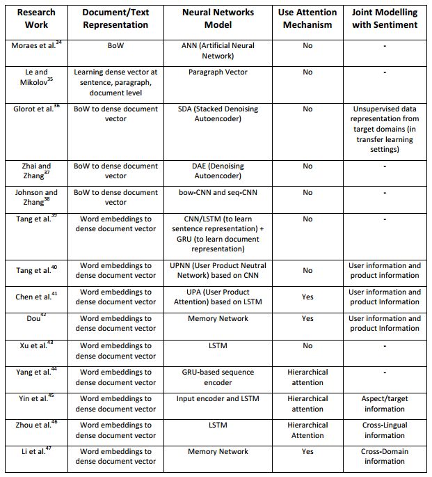 表 2:文档级情感分类的深度学习方法。