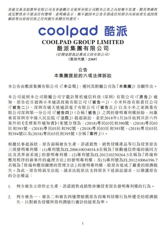 事件起于1月26日,酷派集团发布公告称,该公司接到公司附属宇龙计算机通信科技(深圳)有限公司(原告)通知,原告近日就与小米通讯技术有限公司(被告一)、小米科技有限责任公司(被告二)、深圳市通天达通讯电子有限公司(被告三)以及小米之家商业有限公司深圳第一分公司(被告四)之间的发明专利权纠纷,向广东省深圳市中级人民法院提起诉讼。