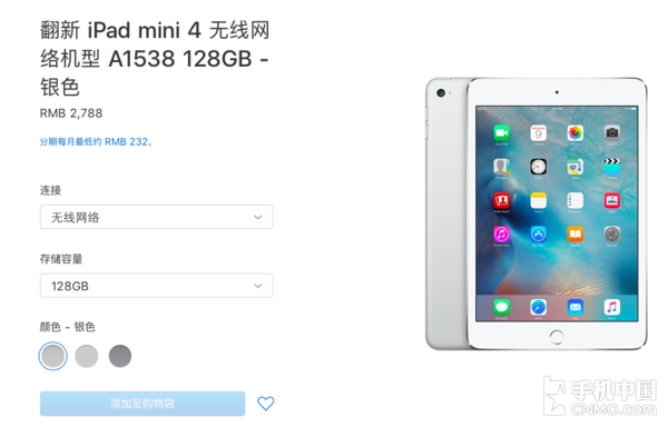 原标题:128GB/2788元 翻新iPad mini 4官网上架 【手机中国 新闻】1月31日