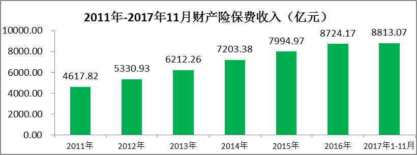 据保监会数据,2016年财产险(包括车险、农业保险等险种)保费收入8724.17亿元,同比增长10.01%,2017年1月~11月财产险保费收入8813.17亿元,预计全面收入近10000亿。