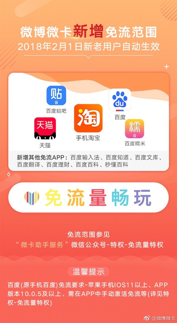 1月29日,微博微卡官方宣布,从2018年2月1日起, 微博微卡新增百度贴吧、天猫、手机淘宝、手机百度、百度糯米、百度输入法、百度知道、百度文库、百度翻译、百度理财、百度百科、秒懂百科 等App免流服务。