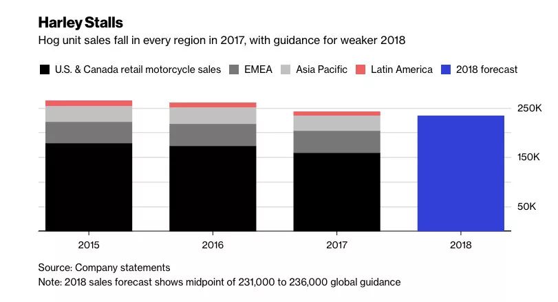 图片来自:彭博社 不只哈雷,几乎所有的传统摩托车制造商都在经历这种转型期的阵痛。在 2017 年第四季度,美国摩托车市场的整体销售额减少了差不多 6.5%。 也许对经历过上个世纪六七十年代嬉皮士文化的 “垮掉的一代” 来说,能够拥有一辆体型巨大、声音也巨大的哈雷摩托车,是一件 “很酷” 的事情;但对正在统治当下的千禧一代来说,哈雷可能已经是一件老古董了。