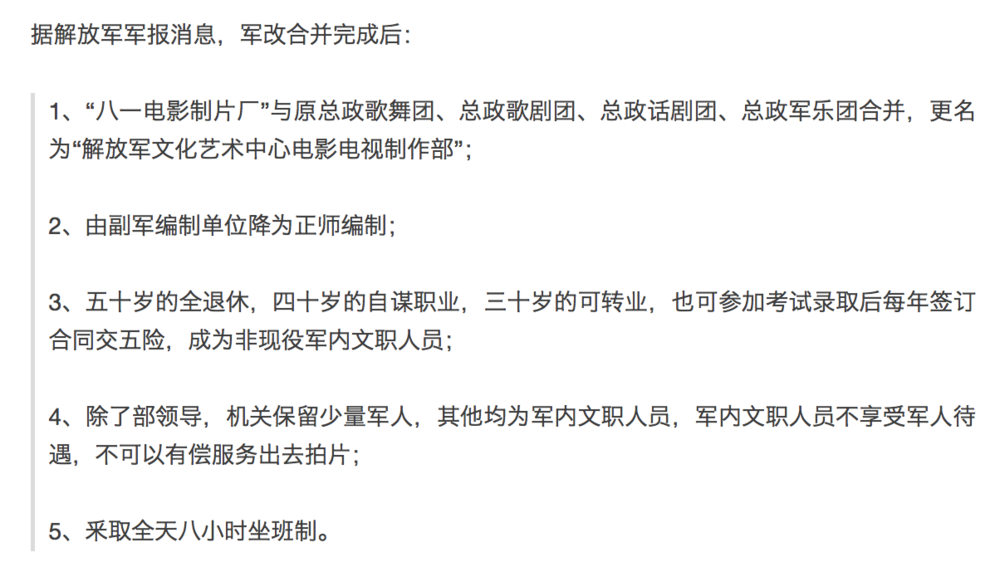 据解放军军报消息,“八一电影制片厂”正式面临改制,将与总政歌舞团、总政话剧团等单位一同并入中国人民解放军军事艺术中心,并更名为“解放军文化艺术中心电影电视制作部”;由副军编制单位降为正师编制。