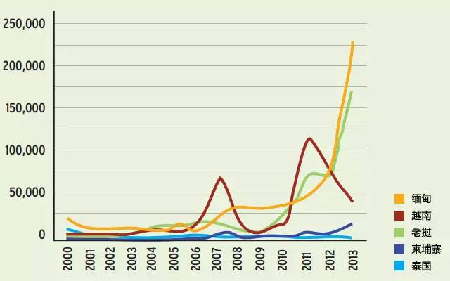 2000年至2013年中国从大湄公河次区域进口的红木原木,单位:立方米。图片:eia-international.org