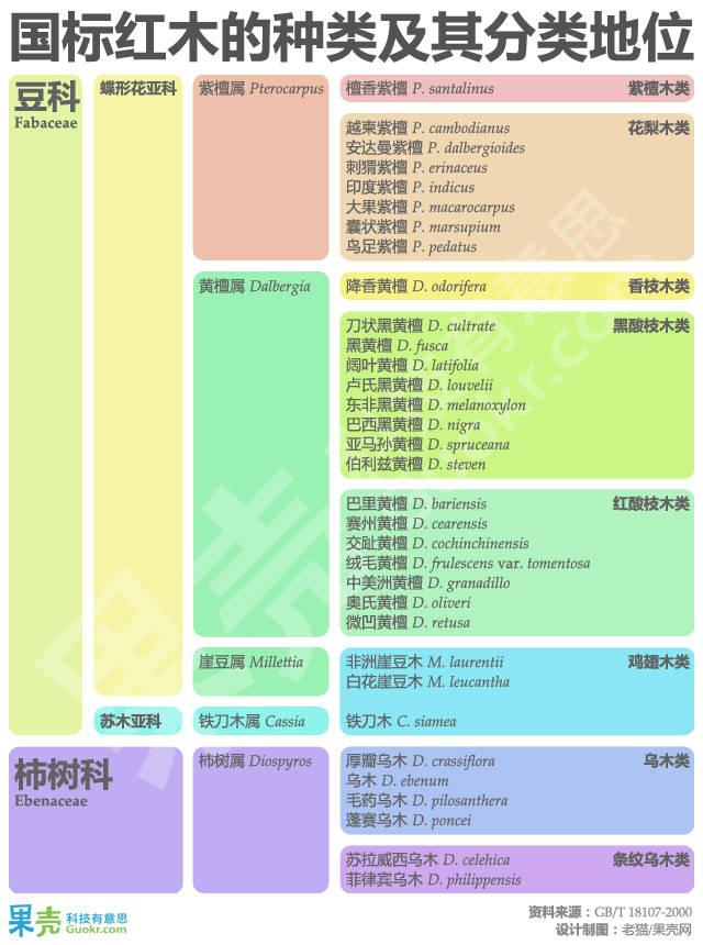 在传统概念中,“红木”是指豆科黄檀属的交趾黄檀的心材。而在改革开放之后,进口热带木材越来越多,商家起的名字也五花八门,红木的概念就逐渐被扩大化了。2008年中国颁布了红木国标 (GB/T 18107-2000):