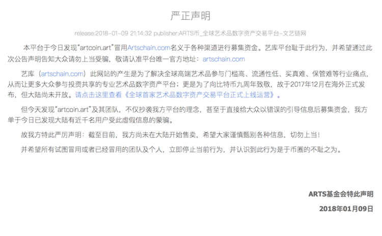 而 ARTS 在 ICO 前期宣传中故意使用了「艺库网」的名义进行募资,在群发私募信息中也借用了艺库网的域名和名义,这一点被真正的艺库网发表辟谣声明,称 ARTS 与其无关,指责 ARTS 项目是「李鬼」。