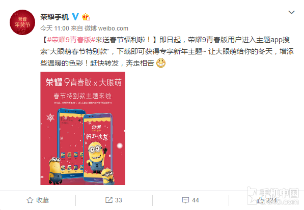 今天荣耀手机官方微博表示:“即日起,荣耀9青春版用户进入主题app搜索“大眼萌春节特别款”,下载即可获得专享新年主题~ 让大眼萌给你的冬天,增添些温暖的色彩!赶快转发,奔走相告”。有了它,手机也能红红火火的过大年啦!