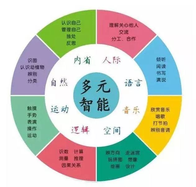 美国哈佛大学发展心理学家哈沃德·加德纳在1983年提出了多元智能理论,将智力分为语文、数理逻辑、空间、肢体动觉、音乐、人际、内省、自然八类,并且认为每个人都拥有独特的一套智力组合体系。