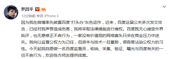 随后,罗昌平通过微博回应称,“因为我在微博率先披露百度‘打头办’灰色运作,近来,百度这届公关多次发文攻击,已经对我声誉造成伤害,我将采取法律措施进行维权。”