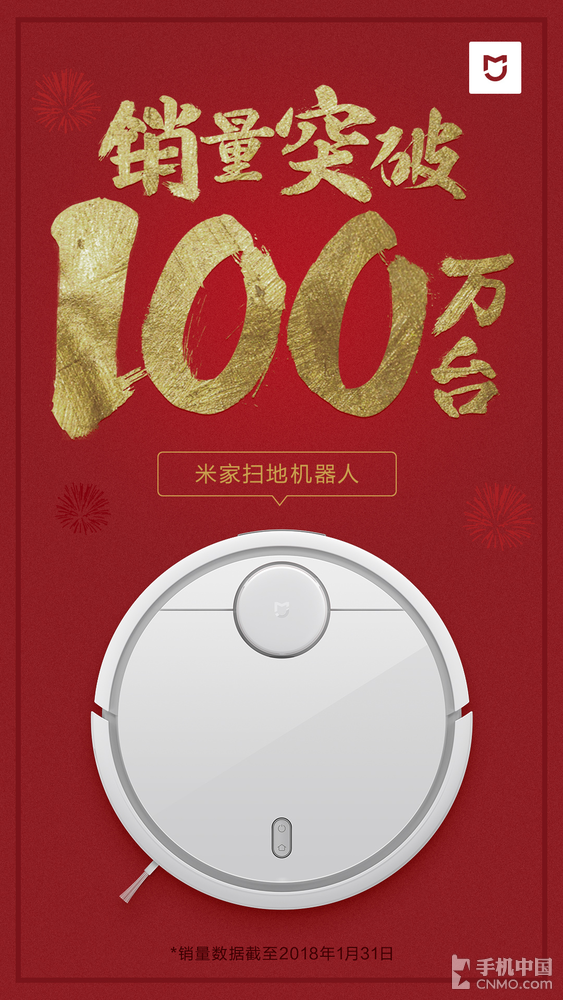 【手机中国 新闻】近日,米家官方微博发出了一张海报,对外宣布截至2018年1月31日,米家扫地机器人销量已经正式突破了100万台,对于一款从2016年9月初开售,上市至今尚不到1年半的扫地机器人来说这个速度可谓相当惊人,已经成为了年轻的扫地小秘籍。