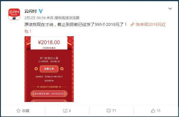 除了支付宝与QQ、淘宝,其他金融机构也纷纷跟进春节红包团,2月5日,银联宣布,其云闪付APP将在当日起,直至3月2日,开启开门大吉红包、天天签到红包、邀请亲友红包、发起转帐红包等云闪付APP四大新春红包。具体包括: