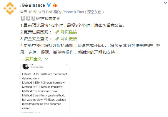 原标题:一再延期!币安仍系统维护中,预计最快1-2小时修复