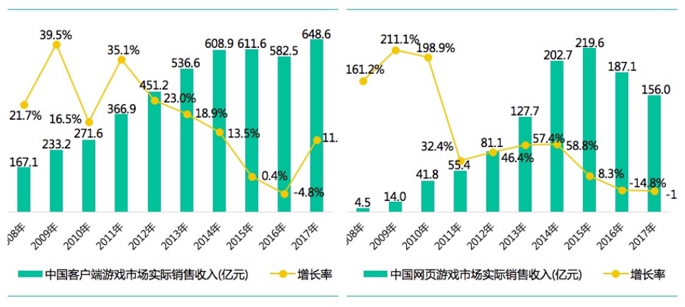 根据《中国游戏产业报告》近几年的数据显示,客户端游戏已经告别了它过去的辉煌,其市场占有率在 2016 年迎来了首次下降。更别提网页游戏了,古天乐和张家辉玩出再多的花来,也难以让人忽视这个市场已经连续 3 年下降的客观事实。