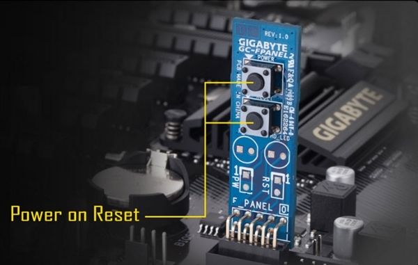 另外由于挖矿平台都是开放摆置,开关机和重启都不太方便,技嘉也提供了 一扩展卡,通过插针接入,提供开关机和重启按钮。