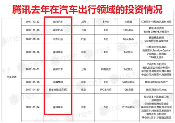 此外,腾讯还投资了易鑫网、易车商城,都是汽车出行方便的投资。蔚来汽车、威马汽车,腾讯也有一定的投资。