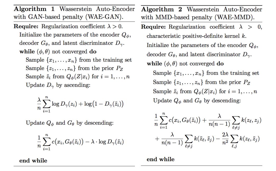 算法 1. Wasserstein 自动编码器和基于 GAN 惩罚的算法(WAE-GAN)。算法 2. Wasserstein 自动编码器和基于 MMD 惩罚的算法(WAE-MMD)。