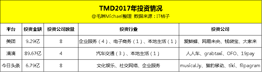 而在投资上TMD也不遑多让,TMD在2017年累计投资了105.75亿元,约占红杉中国全年投资的14.10%,行业更是涉及文化娱乐、汽车交通、企业服务等多个领域。