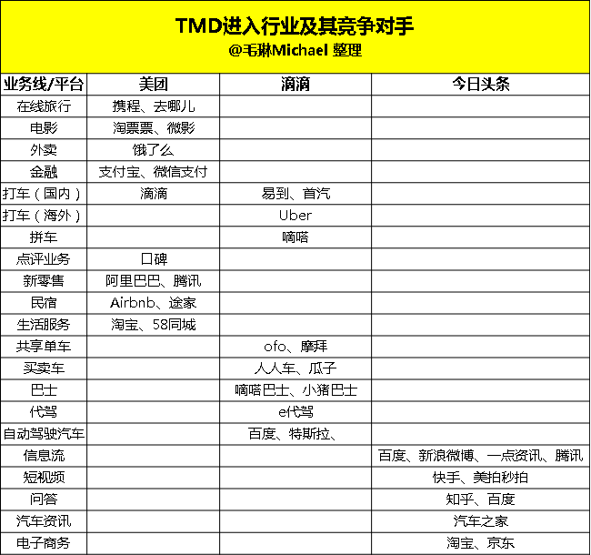 互联网从来都是业绩导向,真正盈利的互联网公司屈指可数,资本充裕市场前景广阔的中国互联网尤其如此,对TMD来说同样无出其右。TMD现有的业务形态注定无法盈利且增长空间见顶:美团的团购模式毛利低,行业一家独大已经没有太多想象空间,滴滴已经成为打车领域绝对霸主,但提价只会造成更严重的口碑效应,今日头条作为算法取胜信息流的模式已经享尽了红利并且被百度腾讯在加大抢占市场份额。现有业务份额已经到头,但低毛利注定盈利能力不可能得到改善,试图成为新一极,或者说短期内为了上市的TMD必须拓展新的业务模式,现有业务的横向纵向发展就成为必须,今日头条推出电商产品,美团曾进入共享充电宝领域,滴滴联合人人车推出买卖车模式.....TMD正在进入与主营业务完全不相关的行业以攫取利润。你做得越多,你的敌人就越多,你试图成为BAT ,那就先将整个互联网视为假想敌。