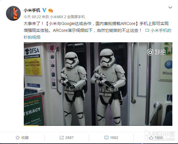 果然,在0点之时,小米手机发布微博表示:“大事来了!【小米与Google达成合作,国内首批搭载ARCore】手机上即可实现增强现实体验。ARCore演示视频如下,当然它能做的不止这些!”原来是小米也将触角伸向了AR领域,并且与谷歌合作,看来未来小米手机也将支持AR技术了。