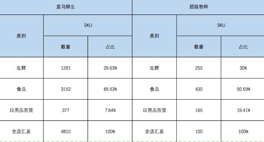 2016年7月,盒马鲜生首家体验店在上海金桥开业,2017年1月,永辉首家“超级物种”体验店,在福建落地。两者皆从“吃”的需求切入,在生鲜零售的基础上,提供餐饮加工服务。根据36kr披露的SKU信息来看,盒马鲜生和“超级物种”生鲜与食品SKU占比都超过80%。