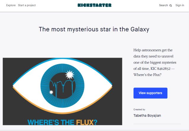天文学家塔比萨·博亚健在众筹网站Kickstarter上发起的众筹项目