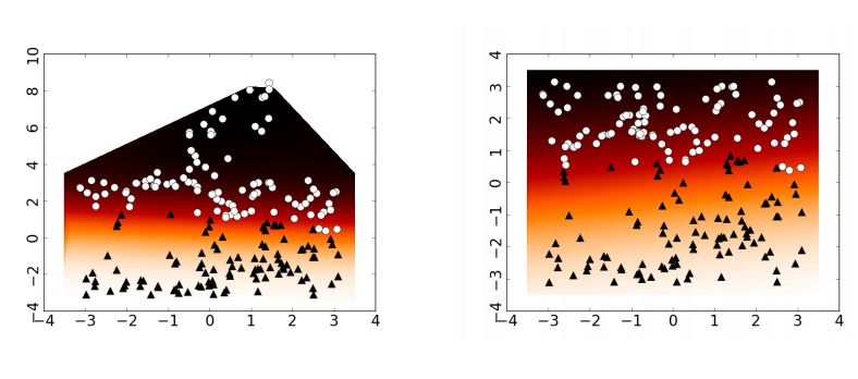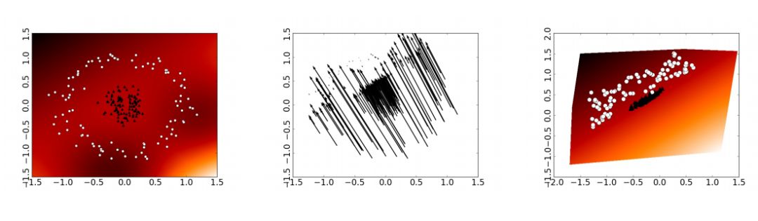在图 4 中,可以看到初始的边界层在变换后的空间中转换成了一个超平面。虽然该算法通过弯曲空间和将圆的中心提取到外部而获得了很好的分类结果,它还生成了初始空间不同点的重叠。