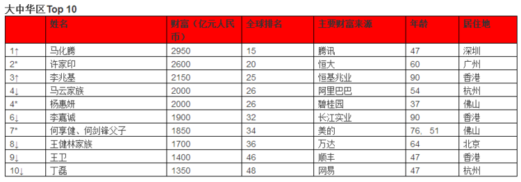 在大中华区的十大富豪中, 47 岁的马化腾财富 2950 亿元正式成为全球华人首富,他是胡润百富榜创立以来第 13 位中国首富。许家印财富 2600 亿元位列大中华区第二,全球第 20 位。马云及其家族财富 2000 亿元位列大中华区第四,全球第 26 位。