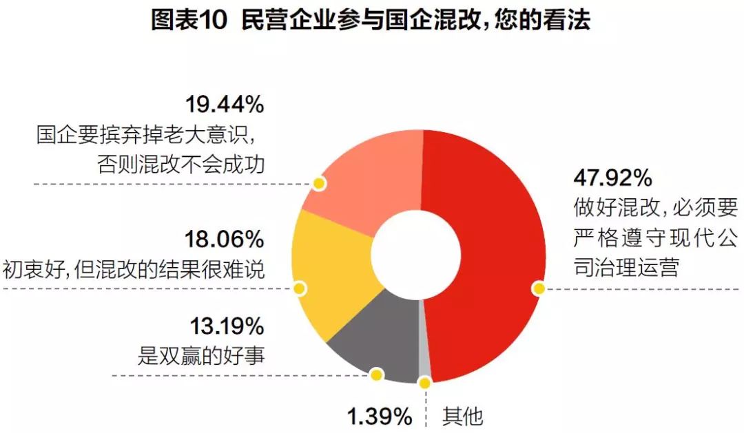 在对中国经济未来前景的判断上,超过半数人认为能保持6.5%以上的增速(见图表9),27.78%的人认为能否达到,要看全球经济的发展趋势。而对混合所有制改革的态度上,近半数人认为,成败的关键在于是否能严格遵守现代公司治理制度。(见图表10)