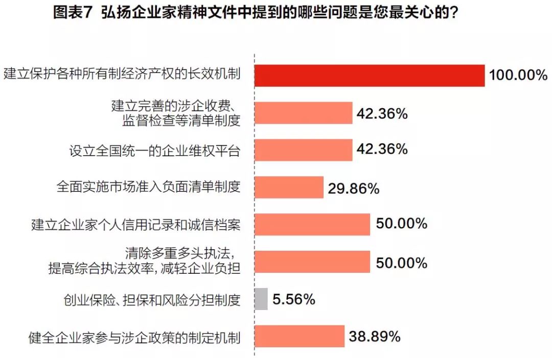 在弘扬企业家精神的《意见》中,提到多项保护和弘扬企业家精神的措施,其中“建立保护各种所有制经济产权的长效机制”成为调研中最受企业关心的一条,获得了100%的选择率。其次是“清除多重执法,提高综合执法效率,减轻企业负担”和“建立企业家个人信用记录和诚信档案”,分别获得了50%的选择率。(见图表7)