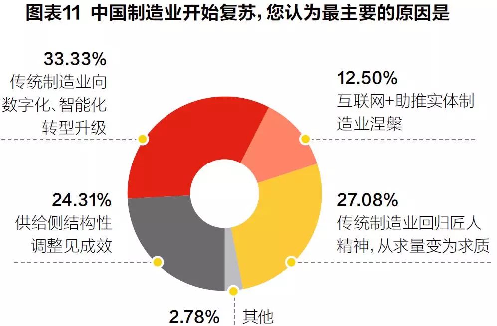 关于对中国制造业逐步回暖主要原因的判断中,认为是传统制造业向数字化、智能化转型升级以及回归匠人精神的占比超过50%。此外,有24.31%的人认为主要是供给侧结构性调整收到成效。(见图表11)