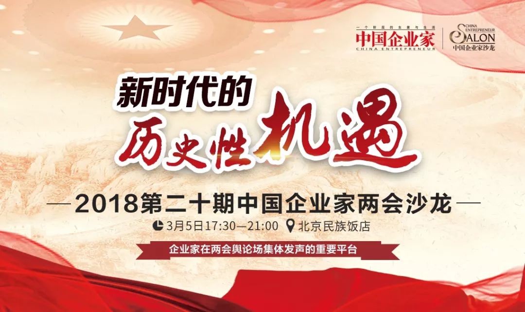 3月5日晚,由《中国企业家》杂志社主办的“2018第二十期中国企业家两会沙龙”将在北京举行,董明珠、刘永好、沈南鹏、李东生、周鸿祎、沈国军、阎志、黄立、袁亚非等二十余位企业家代表委员将畅谈“新时代的历史性机遇”。