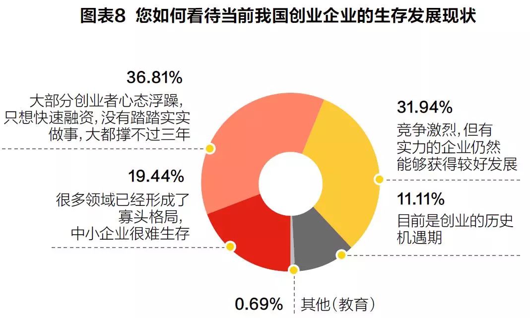 关于创业企业的生存发展现状,调研中有36.81%的人认为,大部分创业者心态浮躁,没有踏实做事,很难撑过三年;31.94%的人认为,有实力的企业仍然能够获得较好发展,仅有11%的人认为目前是创业的历史机遇期。(见图表8)