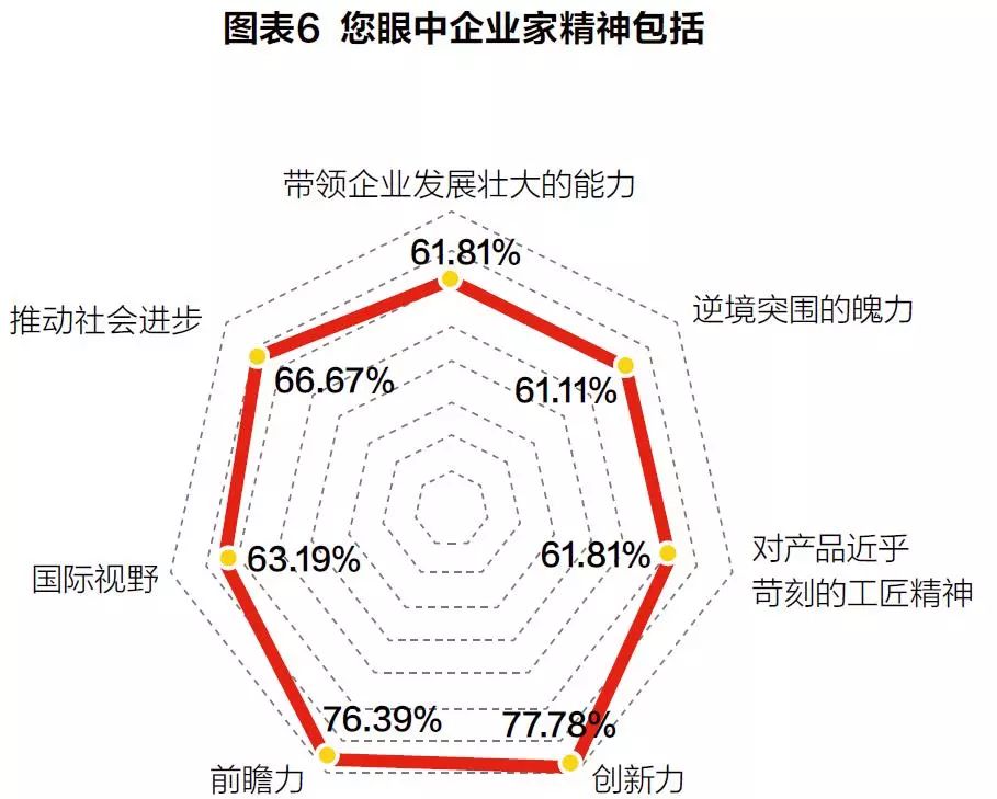 对企业家精神的认知,调研数据也显示出以“创新力”为凸点的均衡认知,包括工匠精神、前瞻力、国际视野和推动社会进步等方面,都成为企业家群体评价企业家精神内核的标尺,而不仅仅是看企业发展规模和经济效益。(见图表6)