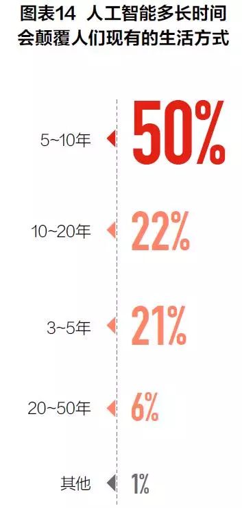 在“未来几年最有可能实现突破的前沿领域”中,人工智能一项拔得头筹(83.33%),其次是新能源汽车(65.97%)和物联网(59.03%),有不少企业在对2018年送出的寄语中,写下了“拥抱AI”“智能转型”等。不仅如此,在调研中有50%的人认为人工智能会在5~10年内颠覆人们现有的生活方式。(见图表13、14)