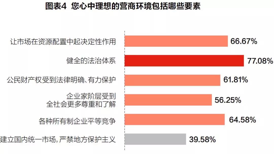 在理想营商环境应该包括哪些要素的选项中,健全的法治体系(77.08%)、让市场在资源配置中起决定性作用(66.67%)、各种所有制企业平等竞争(65.58%)位列前三位(见图表4)。可以看出人们对完善市场经济及相关法律法规的期待。