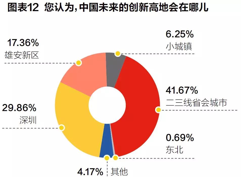 雄安新区是继深圳特区和上海浦东新区之后又一具有全国意义的新区,致力打造成为一座绿色、智慧之城,可以说是含着金钥匙诞生。不过在本次调研中,认为中国未来的创新高地会在雄安的只占17.36%,并且选择了雄安新区的人中,近一半(48%)的企业所在地位于北京和河北,带有较明显的地域倾向性。认为高地将出现在二三线城市和深圳的分别有41.67%和29.86%(见图表12)。其中,杭州、南京、成都、武汉是最被看好的几个准一线城市。