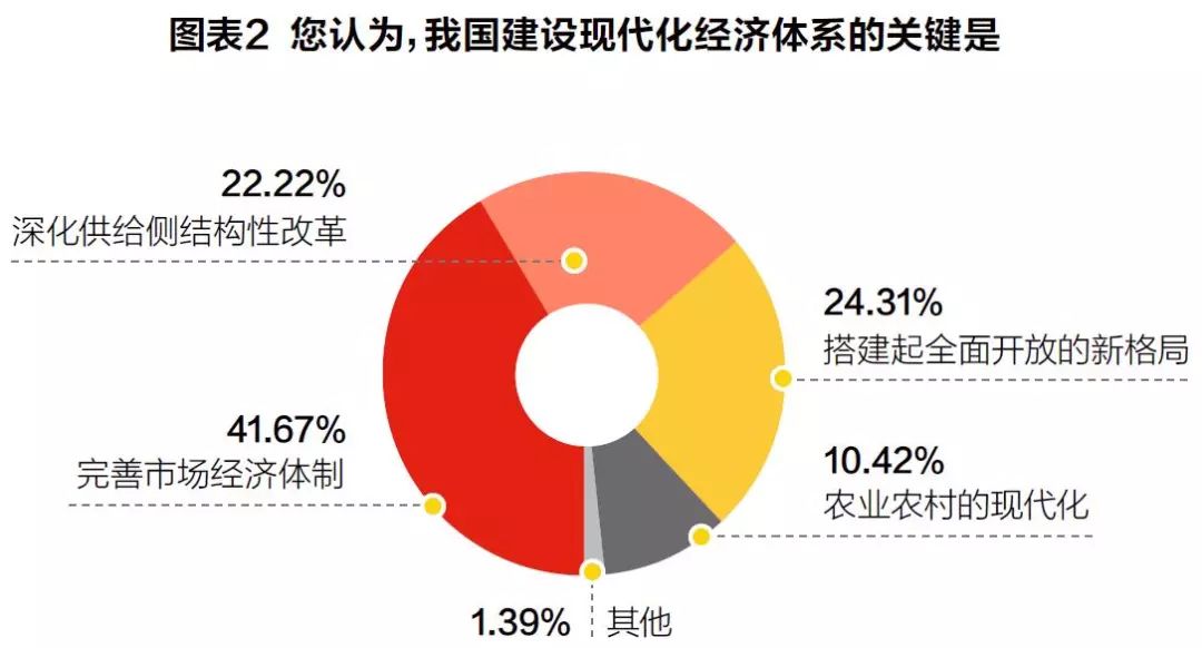 民营企业离市场更近,对市场的跳动脉搏更加敏感,它们是市场经济最积极的参与者和受益者。在本轮调查中,关于建设现代化经济体系,41.67%的受访者认为,完善市场经济体制是关键;24.31%的受访者认为,搭建全面开放的新格局是关键;22.22%的受访者表示是深化供给侧结构性改革。(见图表2)