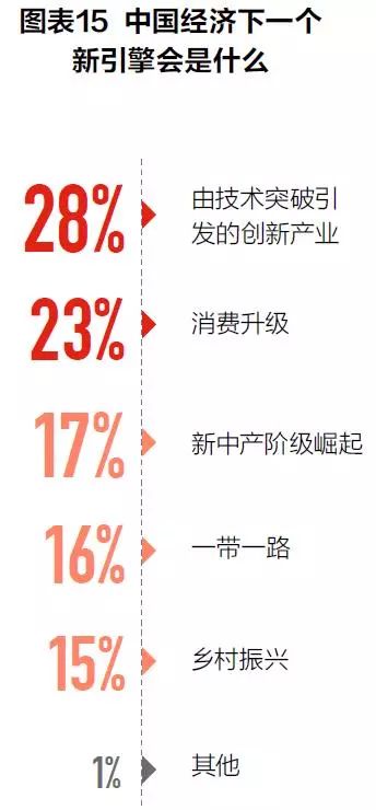 关于中国经济下一个引擎,调研结果显示,参与调研的企业普遍最看好科技,认为由技术突破引发的创新产业会成为下个经济引擎的有28%,其次看好消费升级的占23%,然后是新中产的崛起(17%)。“一带一路”和“乡村振兴”获得的票数并不高,关注度和投票数之间的反差,映射出政府和市场之间微妙的关系。(见图表15)