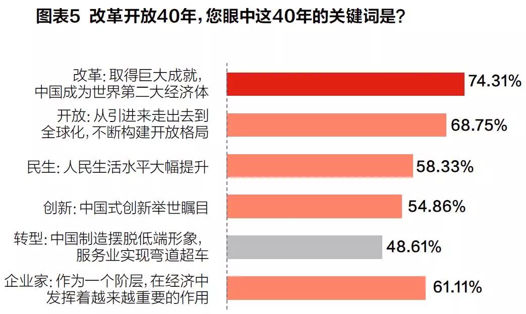 在本次调研中也能清晰地看到,在“改革开放40年你眼中的关键词是什么”一项中,“企业家”一词获得了61.11%的选择率,位列“改革”“开放”之后。(见图表5)