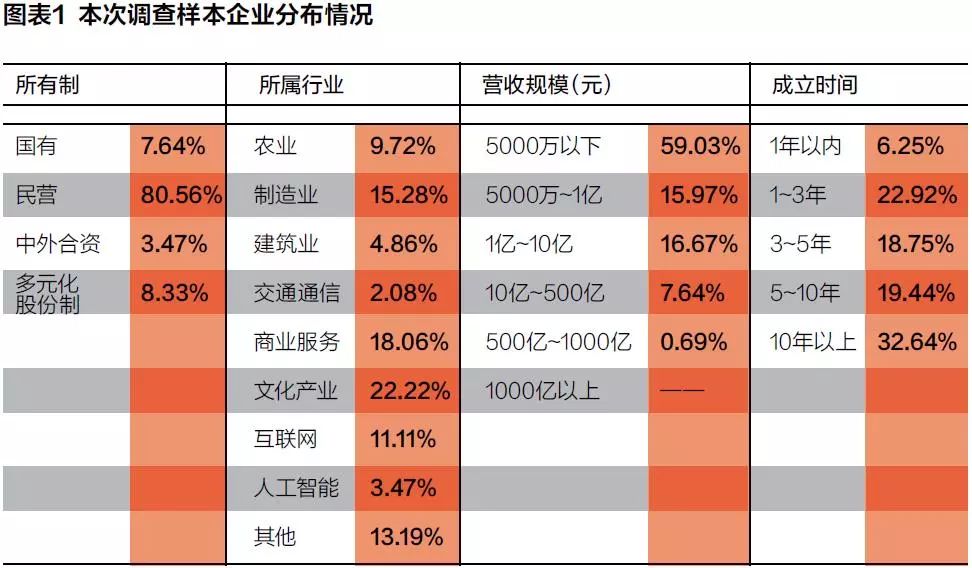 从参与调查的样本企业构成来看,民营企业比例达80.56%,占绝大多数;从营收规模上看,年营收在5000万元以下的小微企业占比为59.03%,营收10亿元以上的大中型企业不到10%;从成立时间上看,成立超过5年的企业占比超过半数(52.08%)。(见图表1)