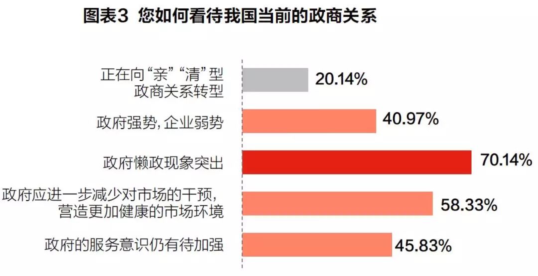 有别于东北地区,随着反腐的深入,很多地方政府因噎废食,出现了不做事不犯错的懒政现象。本次调查中,认为政府懒政现象突出的超过了70%。如果说改革开始前期,更多强调的是政府应该有所不为,到了改革的下半场,也要同时强调政府的有所为和怎么为,坚持以服务意识为导向创新监管方式。