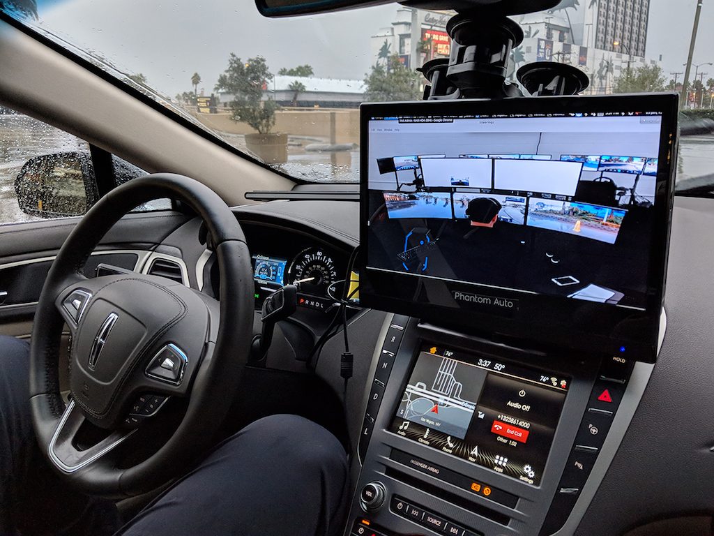 在一台由林肯 MKZ(怎么又是它)改装的无人驾驶车上,Phantom Auto 展示了他们的阶段性成果,车辆的周边环境和仪表数据通过 4G 网络传输至公司,并列显示在 5 个电脑显示器上。