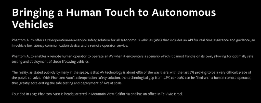 再次,这里面存在一个复杂的伦理逻辑,如果一旦出现信号中断等情况,车辆是否要再从人手里接管车辆,以及是否应该立即停车靠边等,这点 Phantom Auto 没有进行说明。
